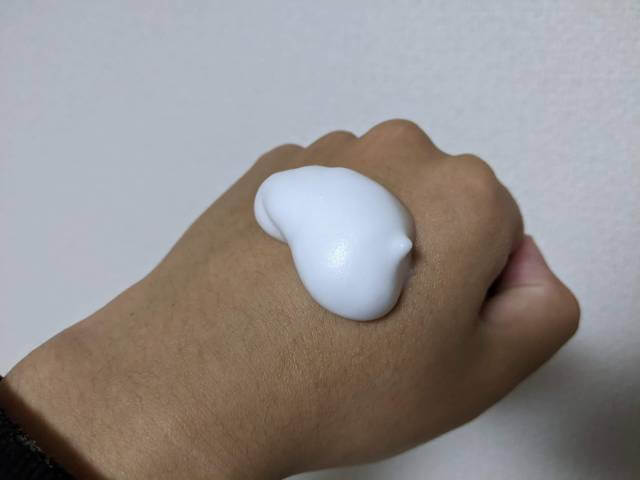 プッシュ式で出てくる泡ですが、もちもちと弾力がある濃密泡という感じではなく、ふわふわとした泡という印象。