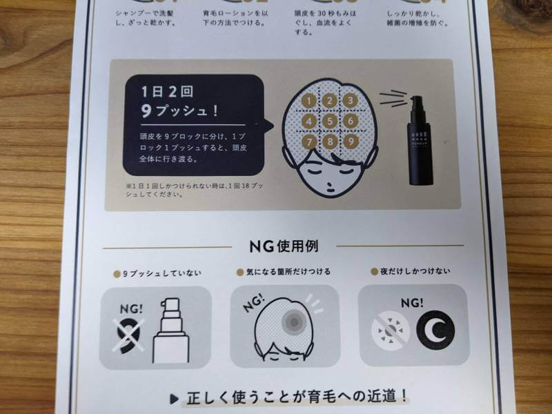 使う際には最初は使用方法通りに9箇所使ってみて、そのあとに多いようだったら自分の頭にあった量に調整して使うのがいいと思います。