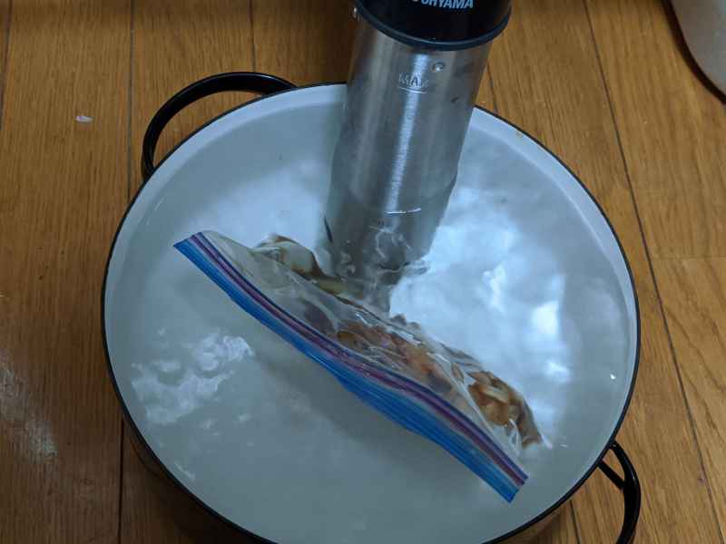 我が家にあった鍋はギリギリで使えたんで大丈夫でしたが、深めの鍋を持っていない方は低温調理用に1つ買っておくといいと思います。